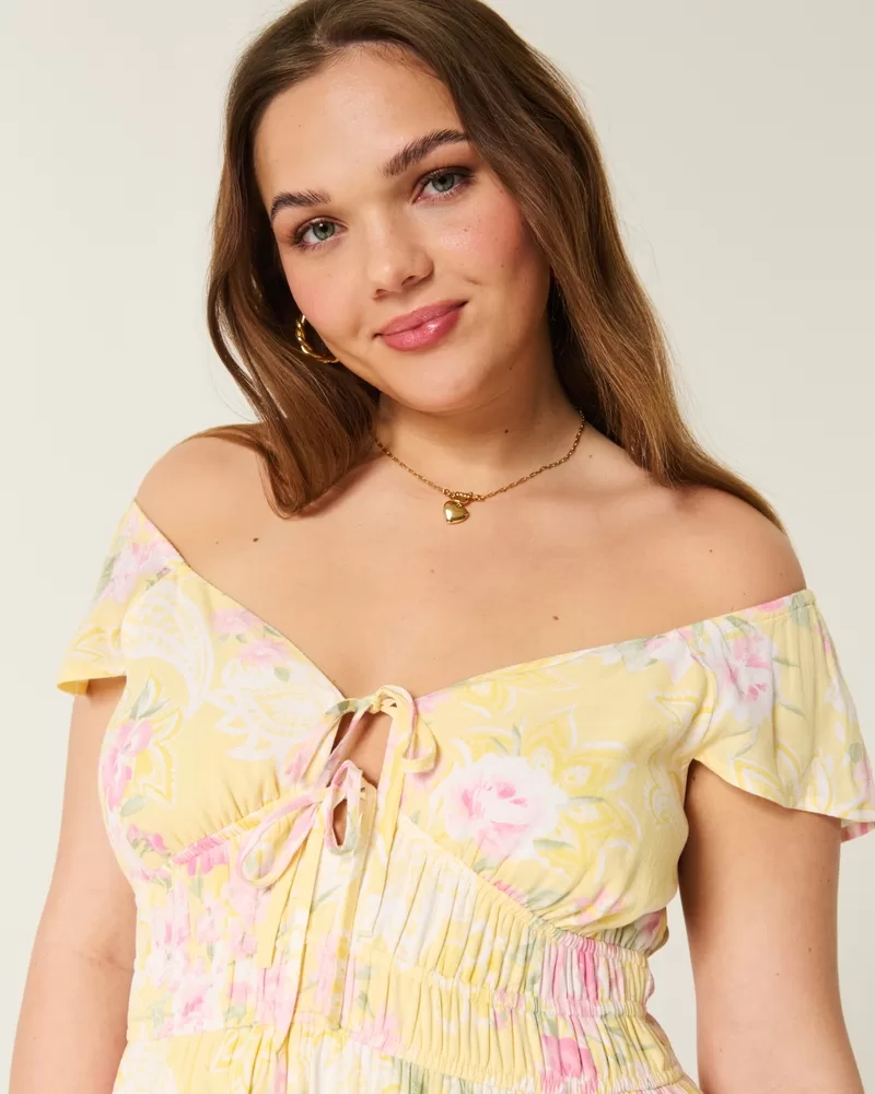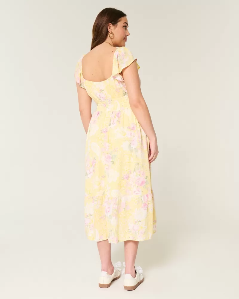 Pretty and super soft, this midi-length dress has flutter sleeves, pockets and a front tie detail. Channeled waist with double ties.