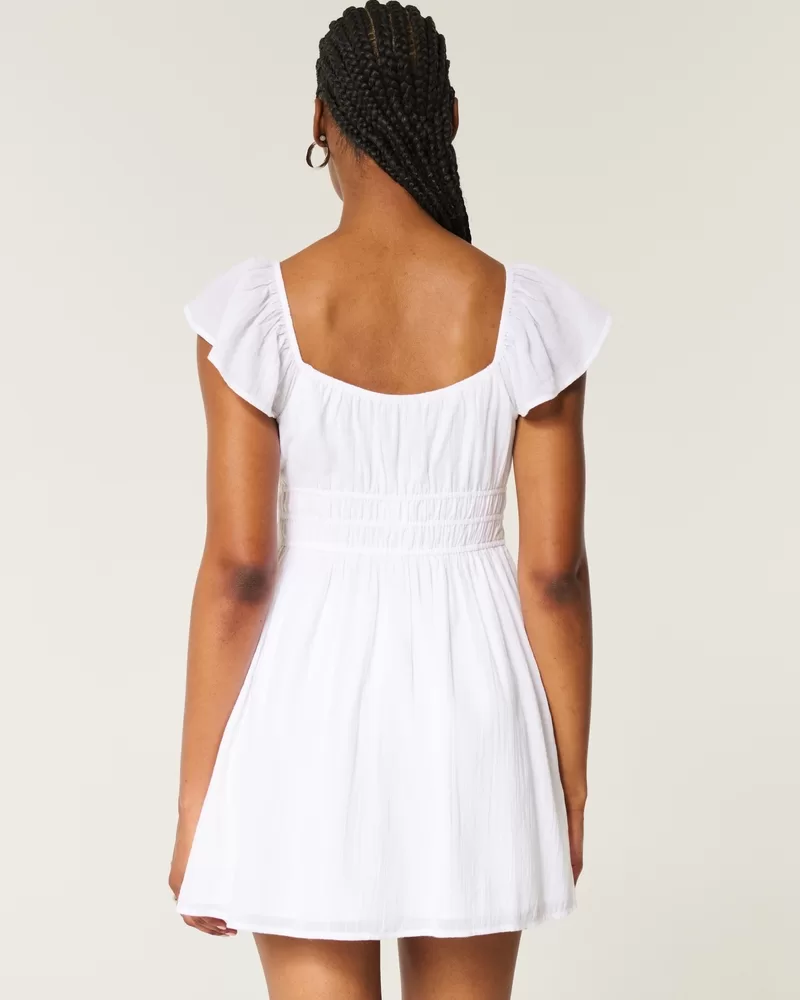 Pretty and super soft, this skort dress has flutter sleeves, pockets and a front tie detail. Hidden bathroom-friendly shorts, channeled waist.