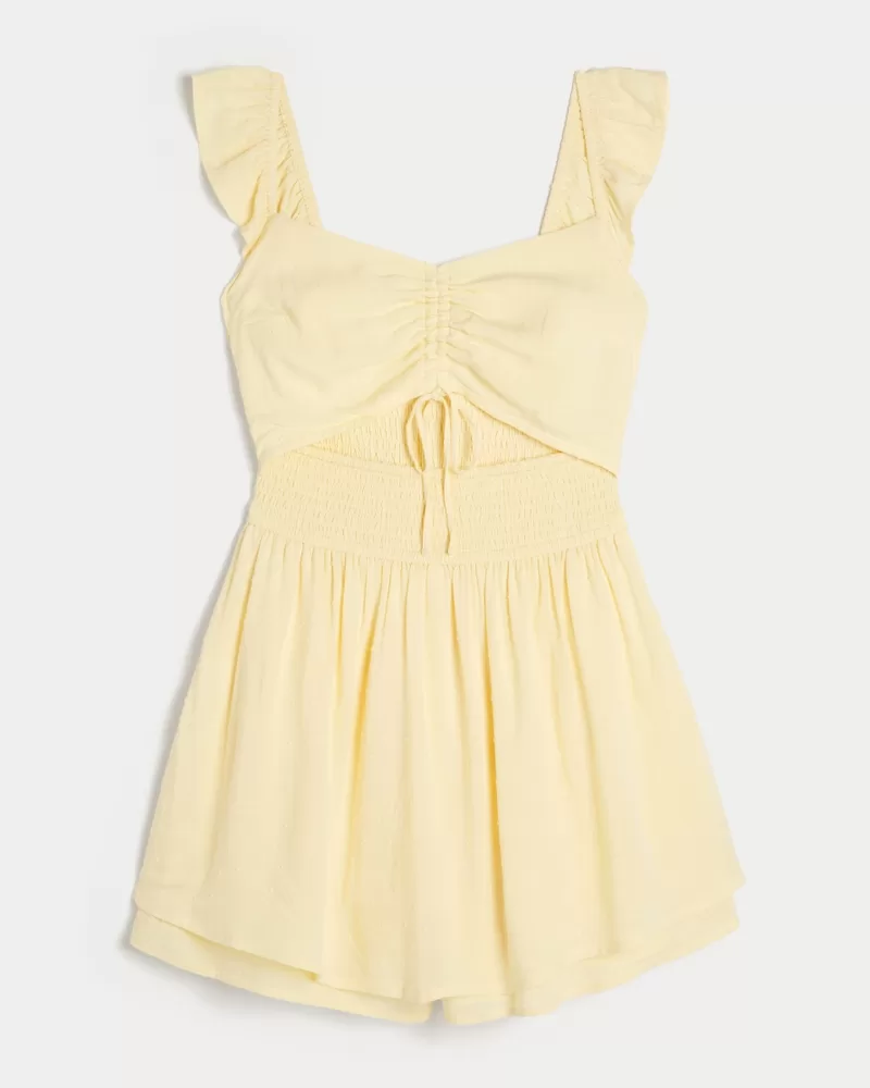 This super cute and soft mini romper has pockets and channeling through the waist. Front cutout detail with adjustable tie at center. Flutter sleeves.