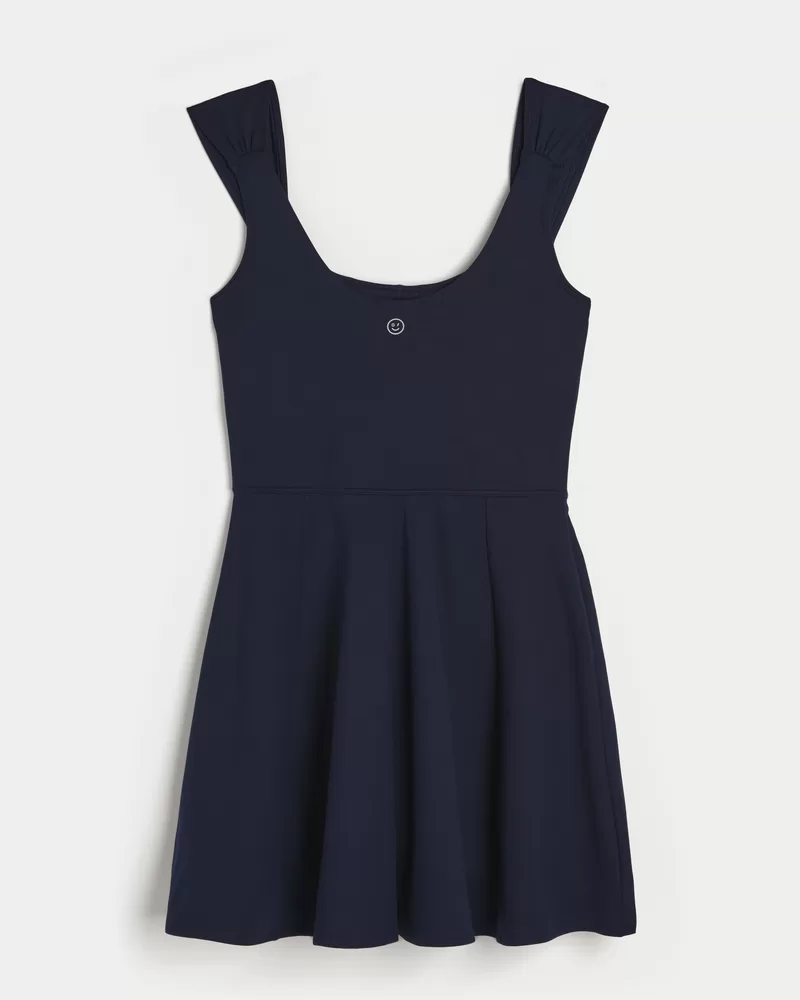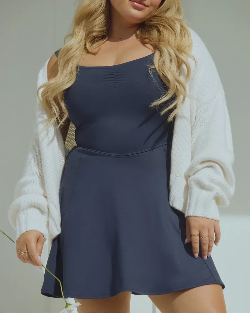 Your new fave dress is made with super soft active fabric and features a built-in shelf bra with removable pads. Built-in shorts with pocket, front cinch detail.
