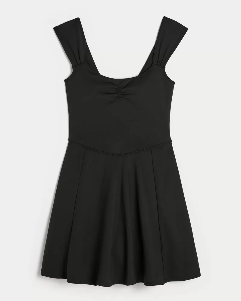 Your new fave dress is made with super soft active fabric and features a built-in shelf bra with removable pads. Built-in shorts with pocket, front cinch detail.