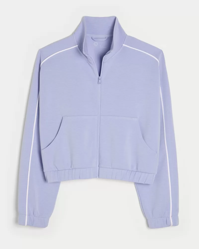 An ultra-comfortable track jacket in our super soft Cooldown fabric, designed with a full zip-up closure, mock neckline, front pockets and cropped length.