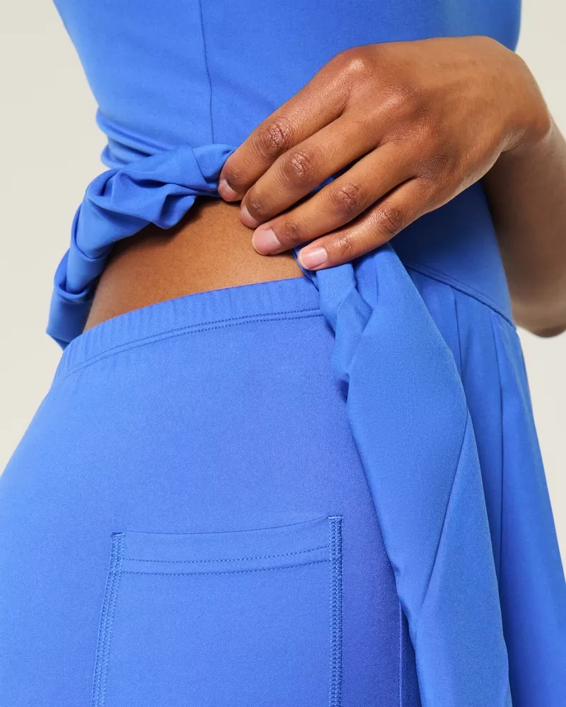 This cute and comfy active dress features a built-in shelf bra with removable pads and built-in bathroom-friendly shorts. Adjustable straps, pretty pleated skirt.