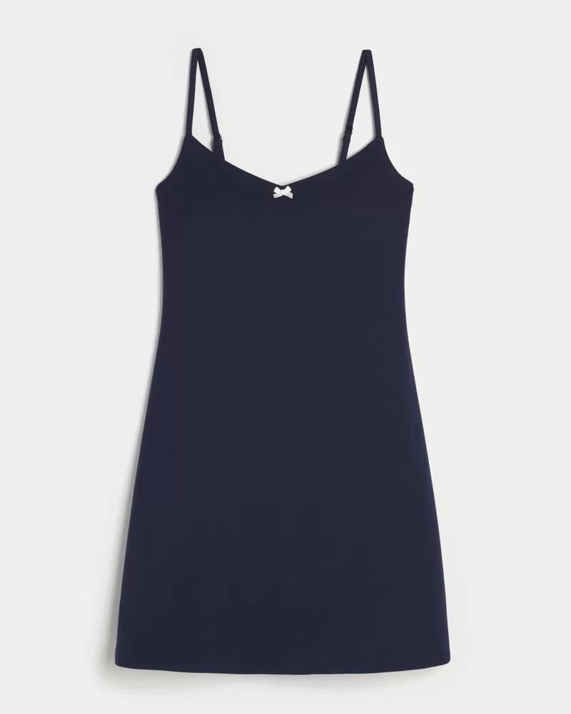 An ultra-comfortable active gameday dress designed in our breathable, 4-way stretch, moisture-wicking Recharge fabric with a super soft, brushed feel. Built-in shelf bra with removable pads, built-in bathroom-friendly shorts with pocket. Cute bow detail at neckline, adjustable straps.