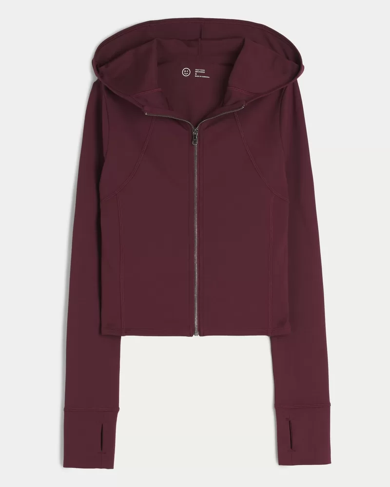 Designed in our breathable, 4-way stretch, moisture-wicking Recharge fabric with a super soft, brushed feel. Zip-up closure, front pockets, long sleeves with thumb openings, cropped length, hood. Imported.