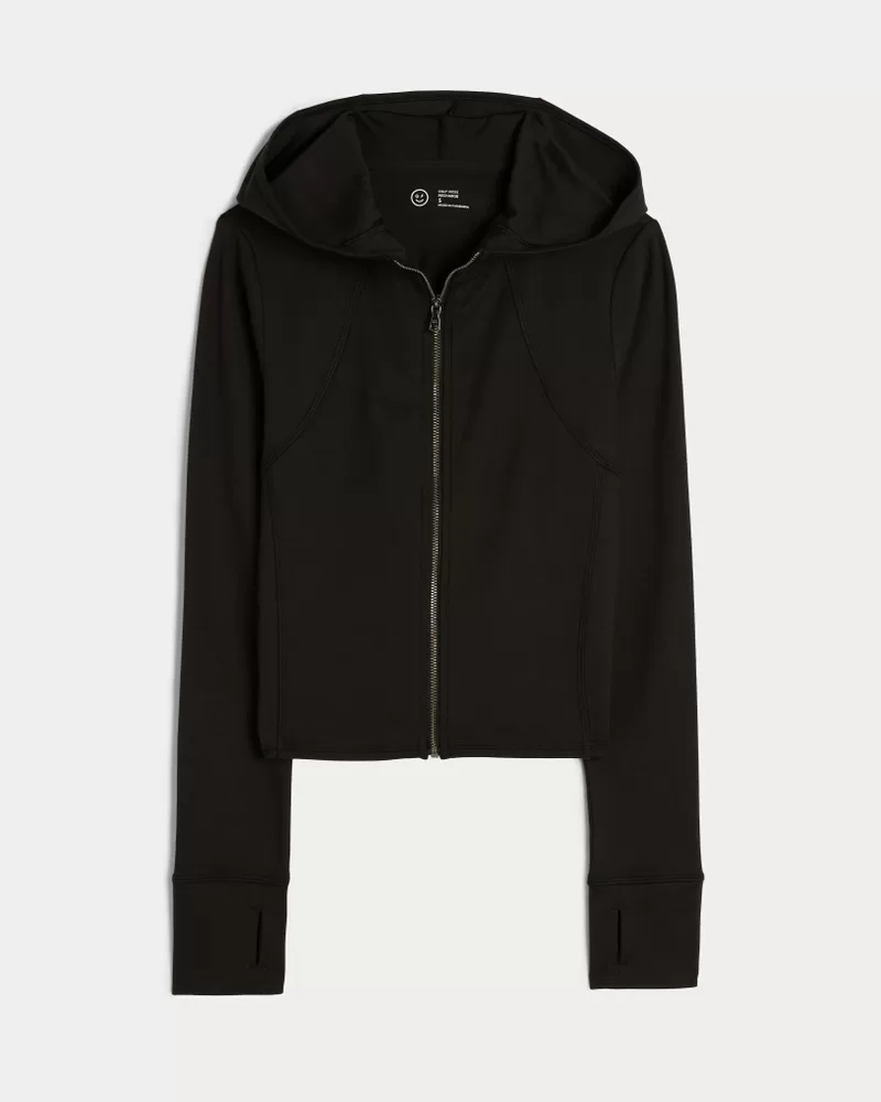 Designed in our breathable, 4-way stretch, moisture-wicking Recharge fabric with a super soft, brushed feel. Zip-up closure, front pockets, long sleeves with thumb openings, cropped length, hood. Imported.