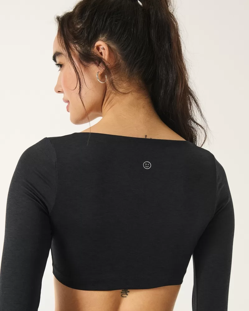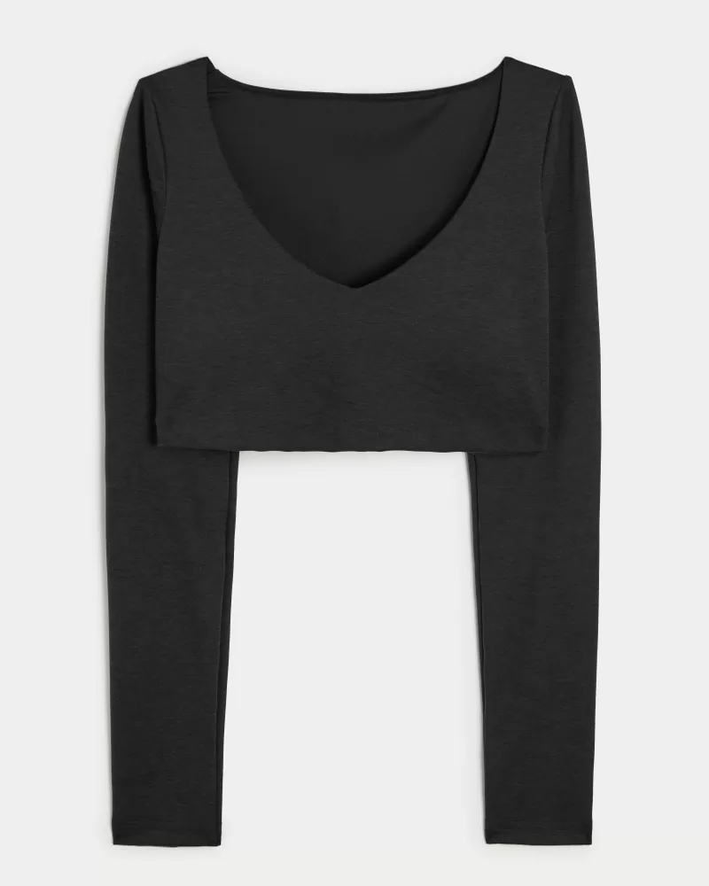 This super cute top is designed in our breathable, 4-way stretch, moisture-wicking Recharge fabric with a super soft, brushed feel. Long sleeves, v-neckline, ultra-cropped length, built-in shelf bra. Imported.