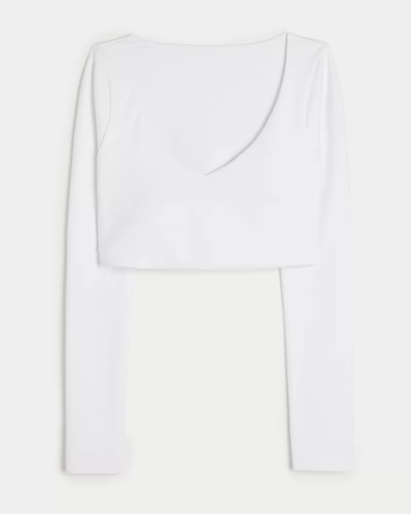 This super cute top is designed in our breathable, 4-way stretch, moisture-wicking Recharge fabric with a super soft, brushed feel. Long sleeves, v-neckline, ultra-cropped length, built-in shelf bra. Imported.