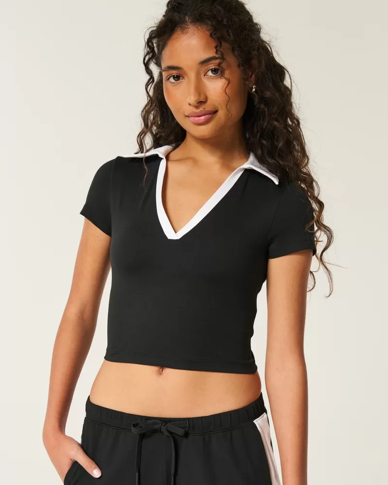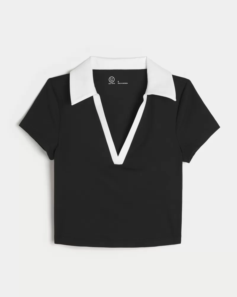 Cute and super soft, this active polo features a buttonless v-neckline, collar and short sleeves. Built-in shelf bra with removable pads.