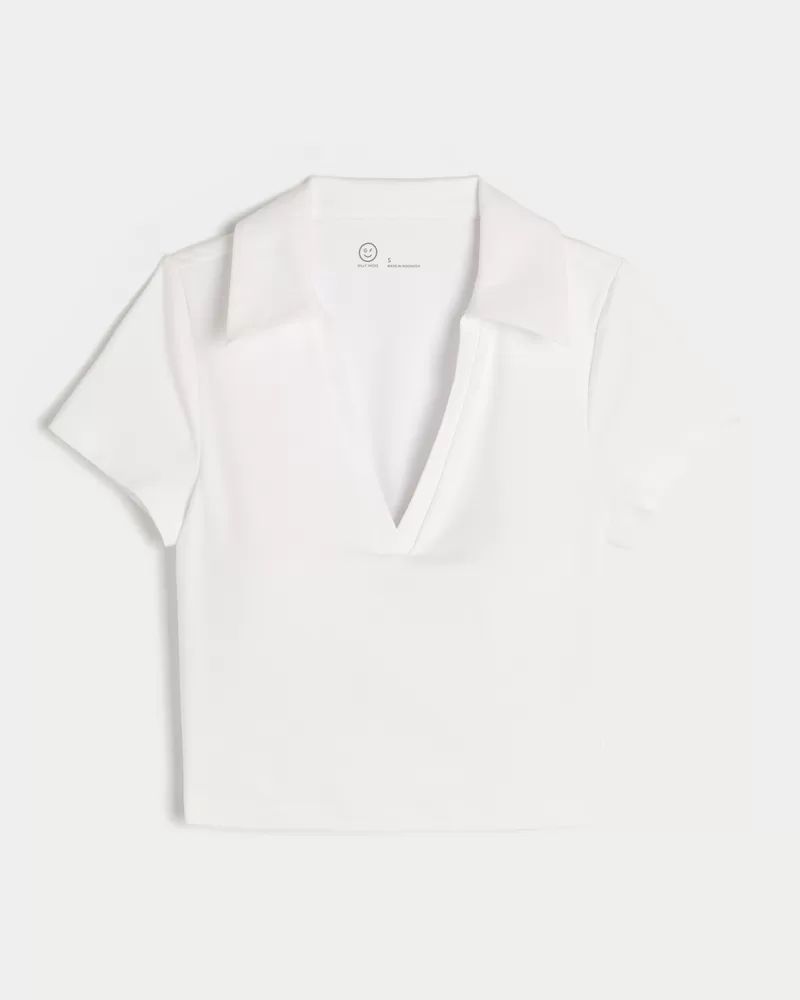 Cute and super soft, this active polo features a buttonless v-neckline, collar and short sleeves. Built-in shelf bra with removable pads. Imported.
