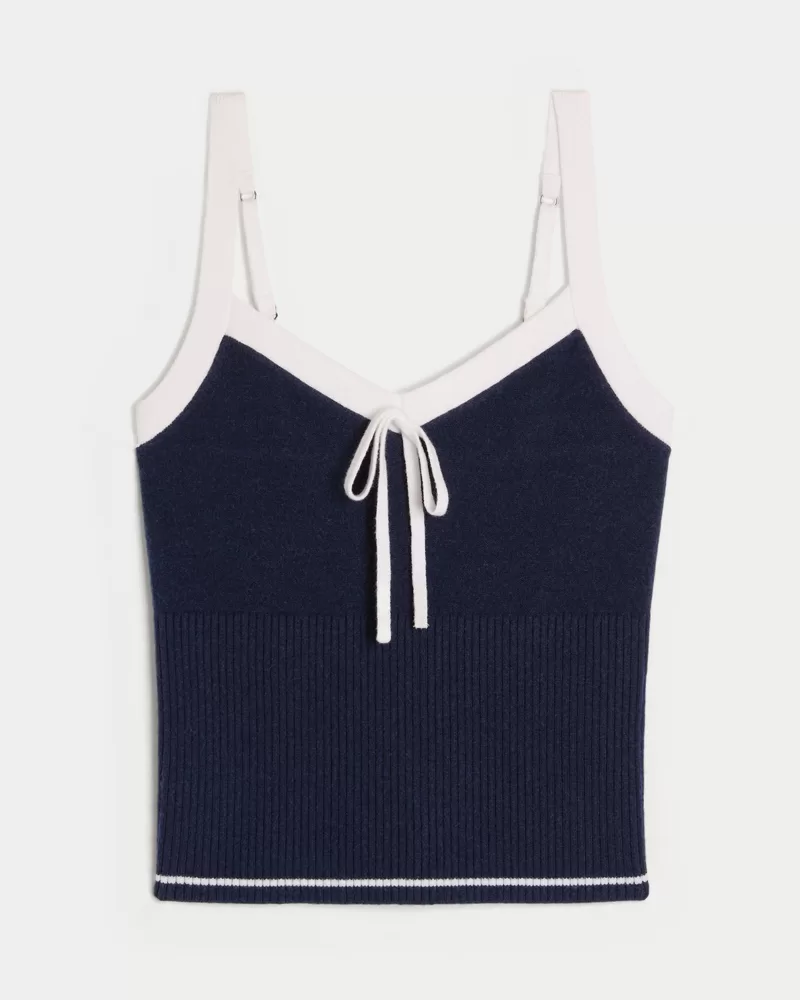 A cozy and super soft sweater-knit tank with a pretty tie detail at the neckline and adjustable straps. Ribbed hem. Imported.
