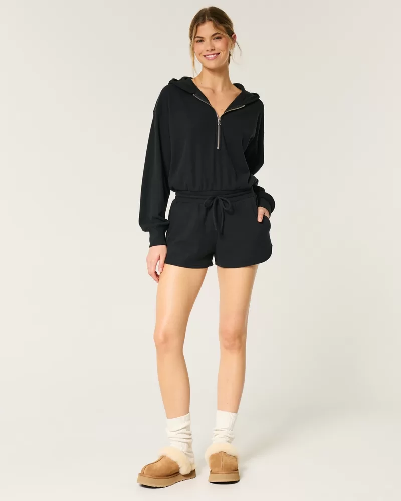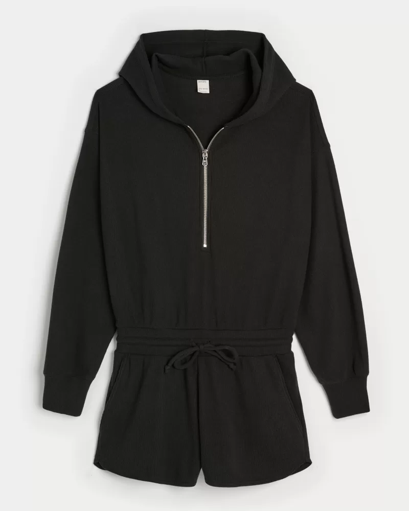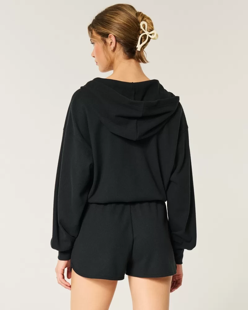 A super soft onesie in cozy waffle fabric. Drawstring waist, shorts, pockets, hood with zipper closure, long sleeves with banded cuffs.