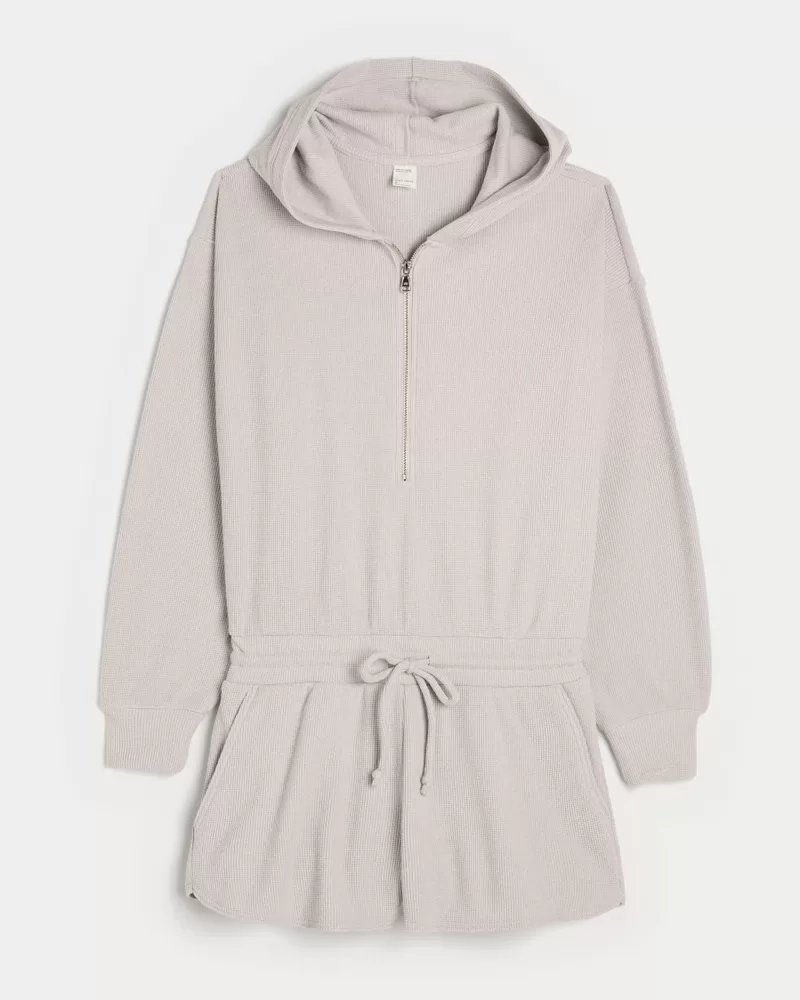 A super soft onesie in cozy waffle fabric. Drawstring waist, shorts, pockets, hood with zipper closure, long sleeves with banded cuffs.