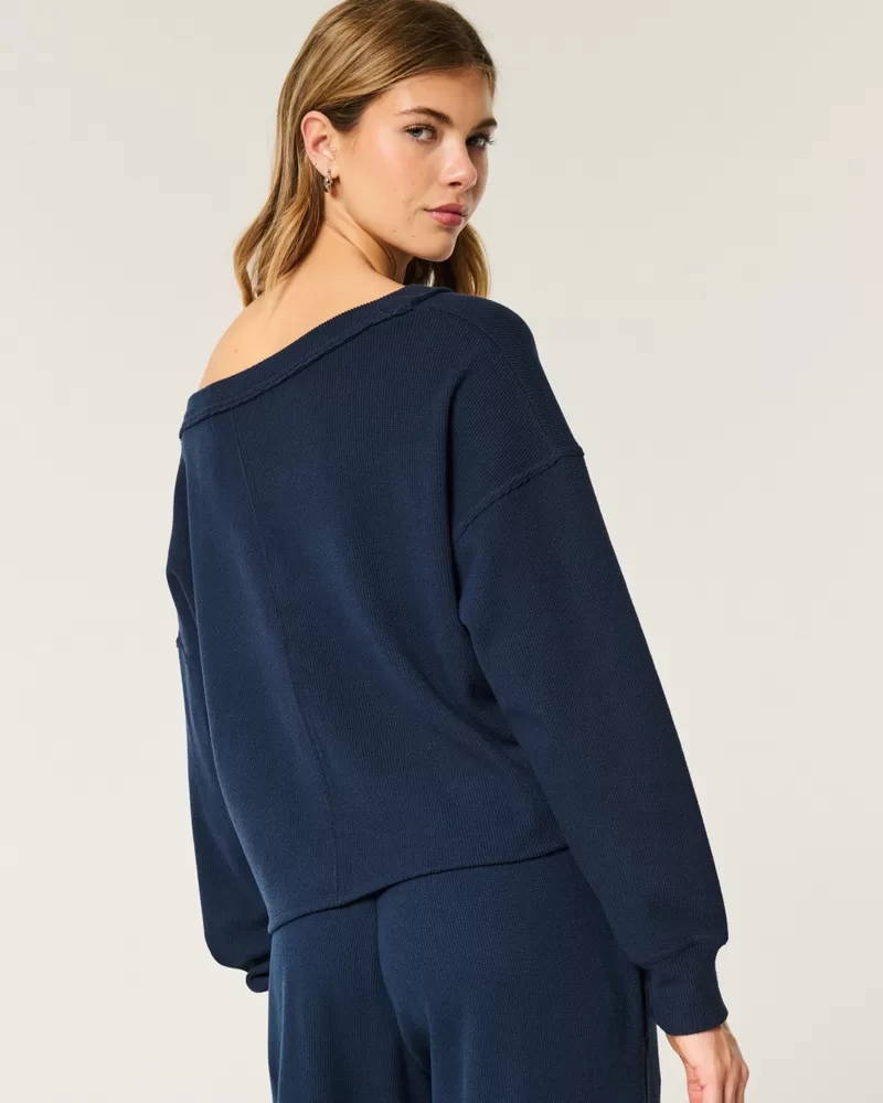 Super soft and cozy, this long-sleeve top is made with waffle fabric and features an off-the-shoulder v-neckline.