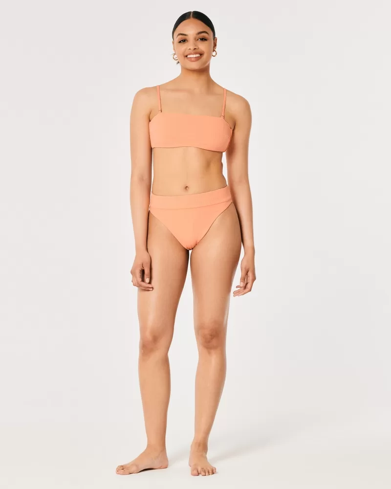 A cute bandeau bikini top with soft ribbed fabric on one side and flat fabric on the other. Removable straps. Made from over 80% recycled materials. Imported.