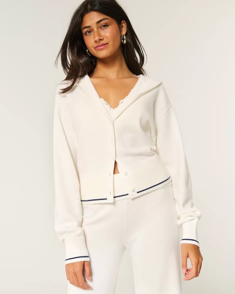 A cozy and super soft cardigan with a hood and full button closure. Ribbed hems, slouchy silhouette. Imported.