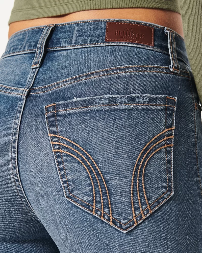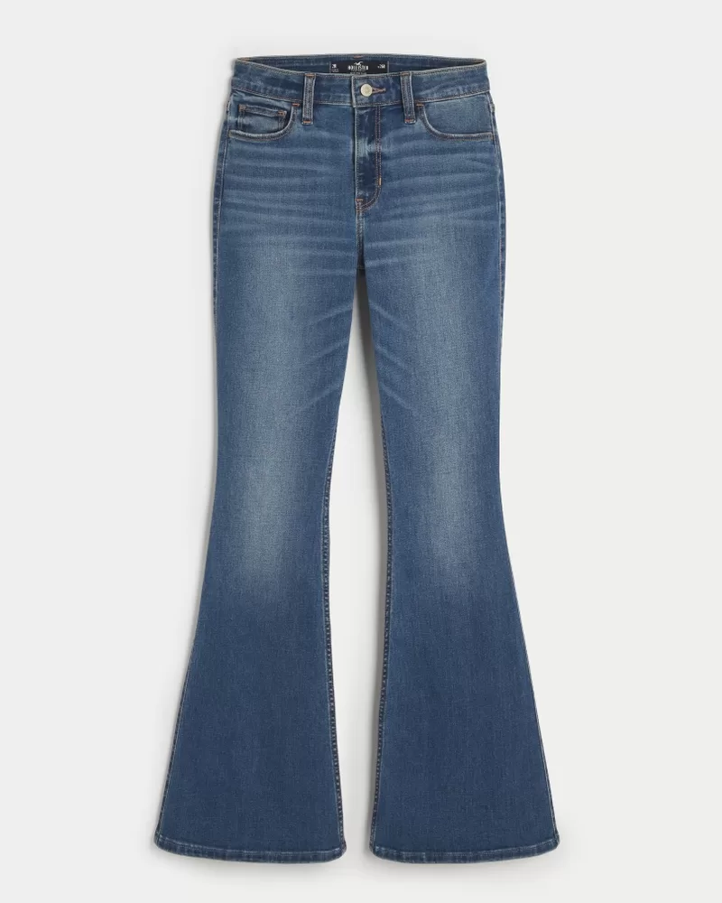 High-rise denim jeans in a medium wash with a vintage-inspired flared leg. Fading and whiskering. Made with stretch.