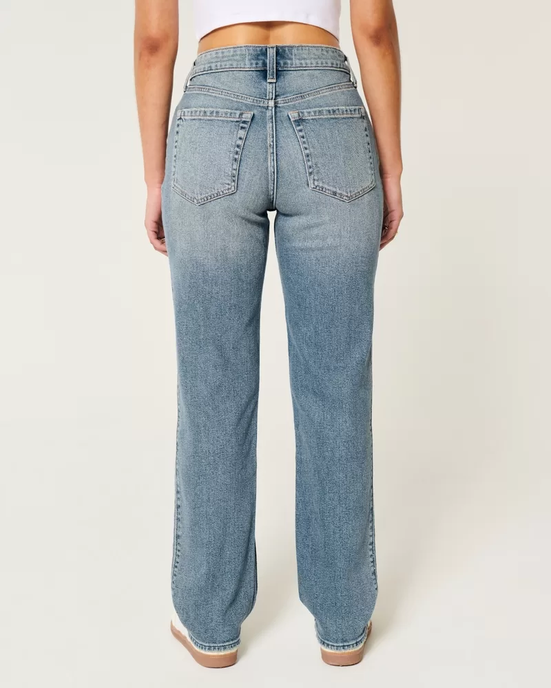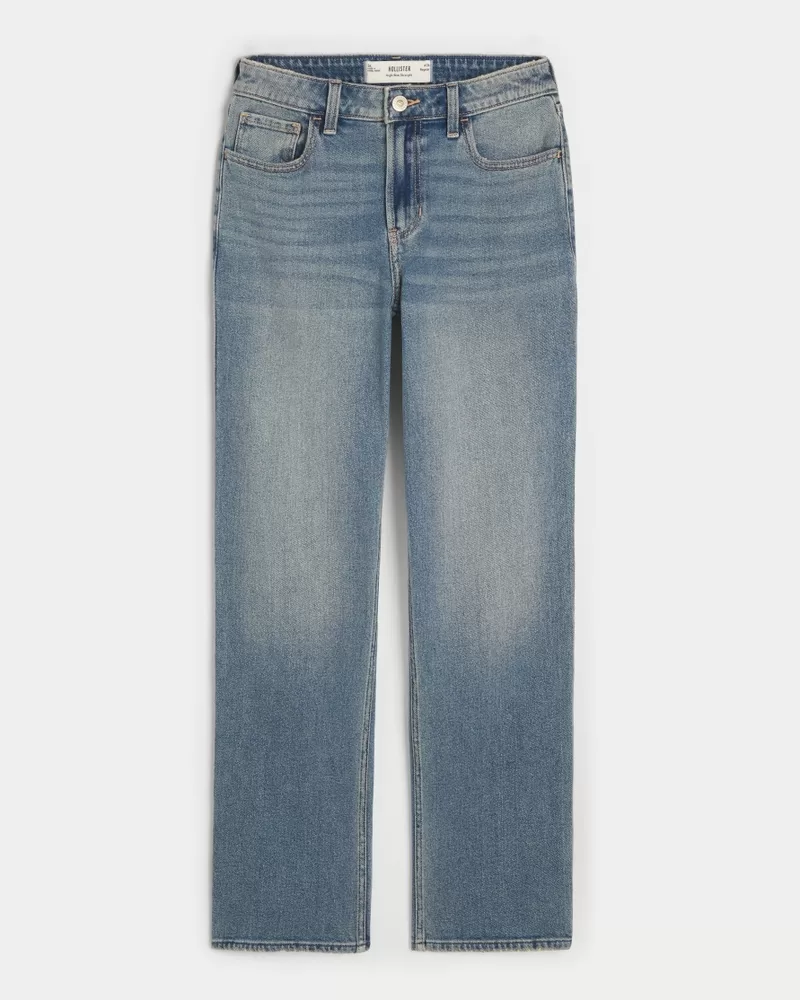 Cute and comfortable jeans in a medium wash with fading and whiskering, designed with a flattering high-rise waist and straight leg.