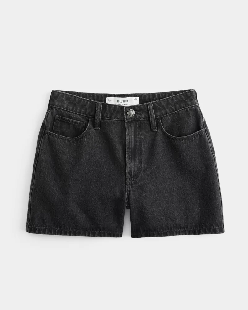 Cute and comfy denim shorts designed with a flattering high-rise waist and relaxed fit. Washed black, 5″ inseam.