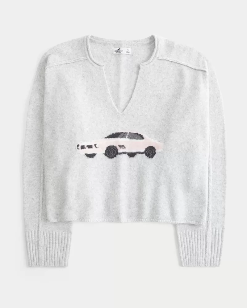 Super soft and comfy, this sweater features a car intarsia graphic. Notch neckline, long sleeves with ribbed hems. Imported.