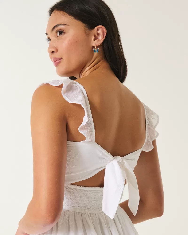A super cute chiffon mini dress with flutter sleeves, pockets and a tie back details. Soft smocked waist, ruched detailing through the bust.