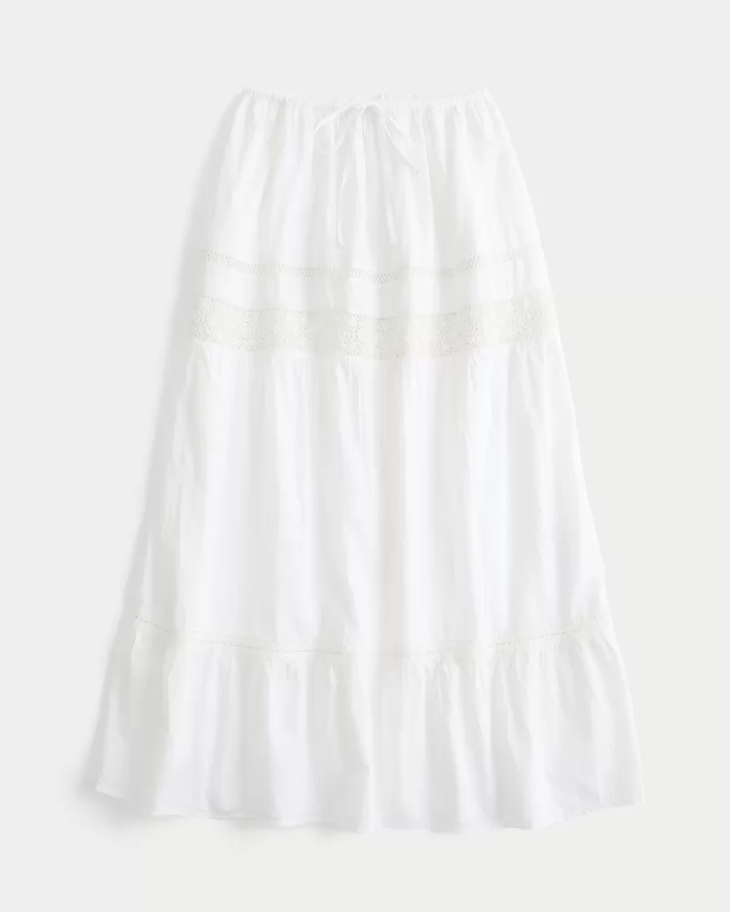 Flowy and super soft, this maxi-length skirt features an adjustable-rise drawstring waist and tiered lace insets. Pockets.