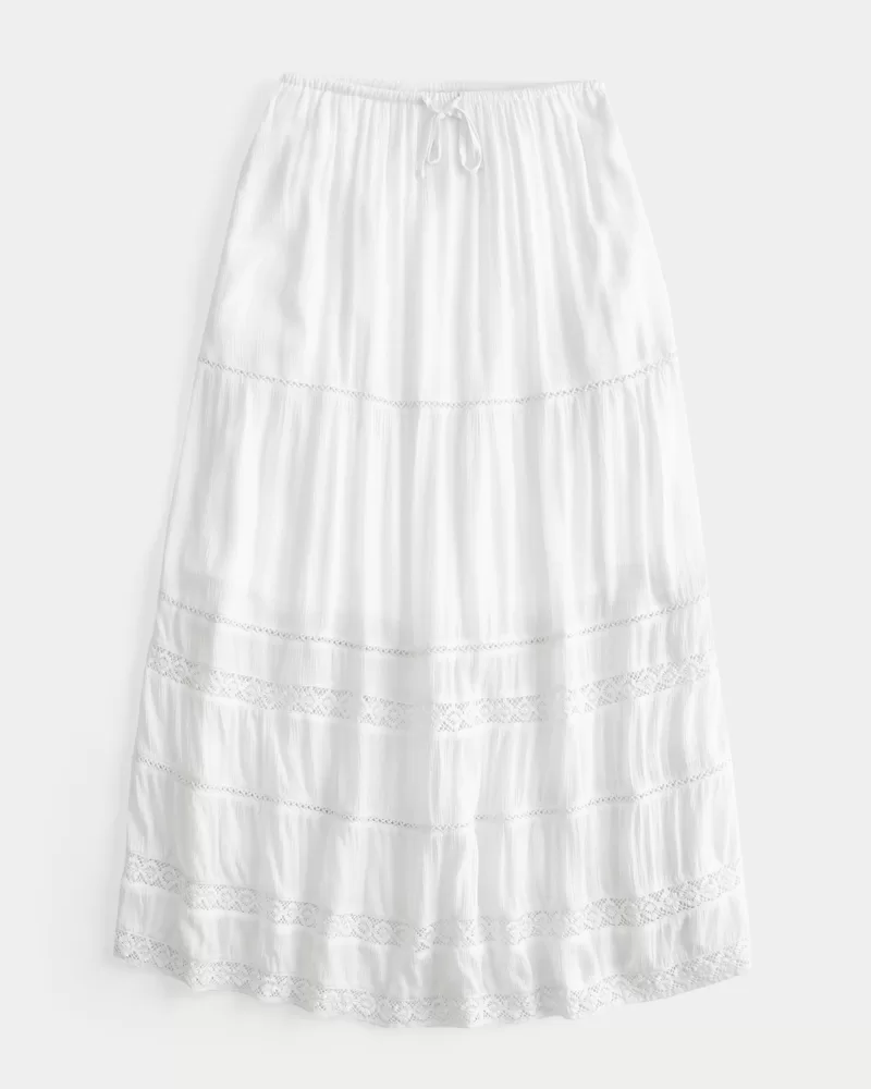 Flowy and super soft, this maxi-length skirt features lace detailing and an adjustable rise drawstring waist.