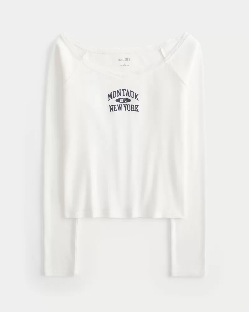 A super soft 100% cotton tee featuring an off-the-shoulder neckline with pretty lace trim and a Montauk New York print graphic. Long sleeves. Slim Fit.