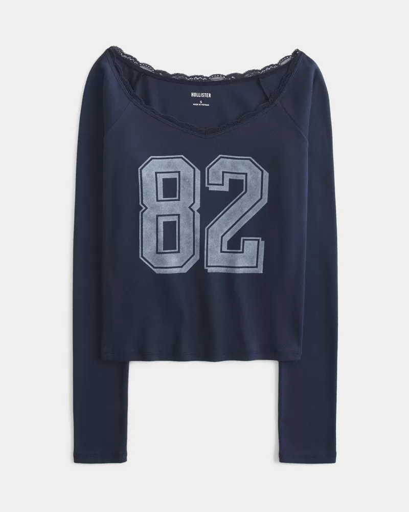 A super soft 100% cotton tee featuring an off-the-shoulder neckline with pretty lace trim and a number print graphic. Long sleeves. Slim Fit.