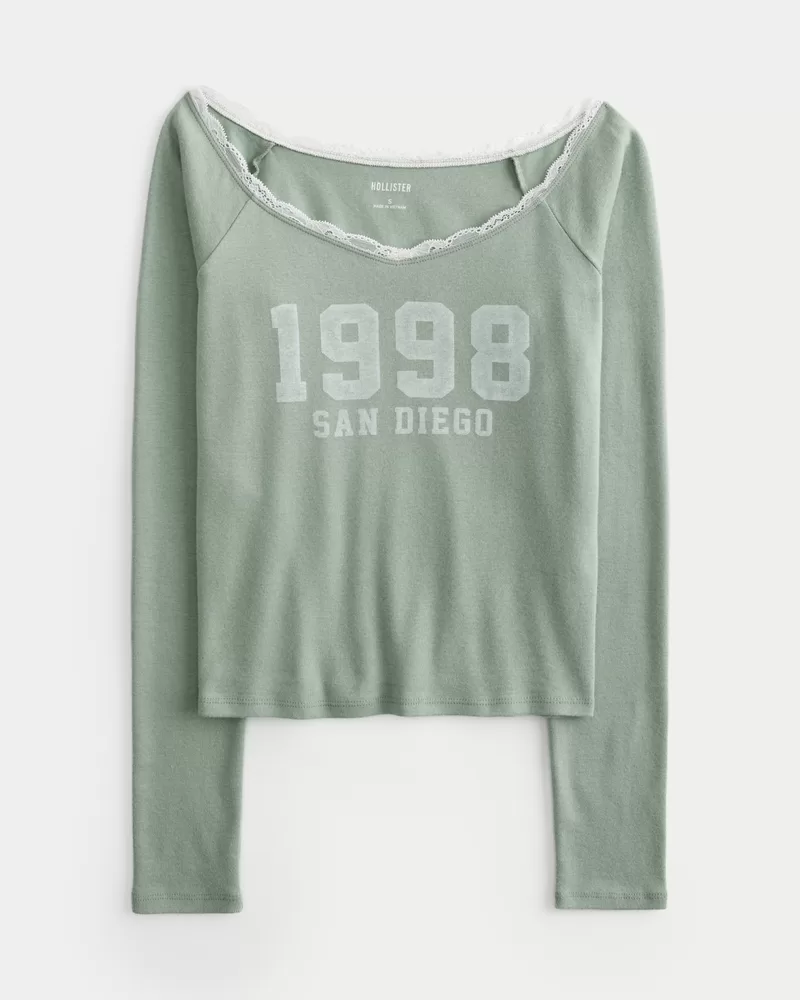 A super soft 100% cotton tee featuring an off-the-shoulder neckline with pretty lace trim and 1988 San Diego print graphics. Long sleeves. Slim Fit.