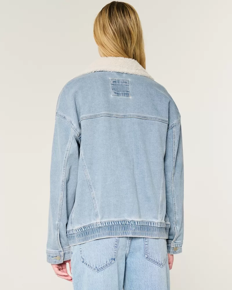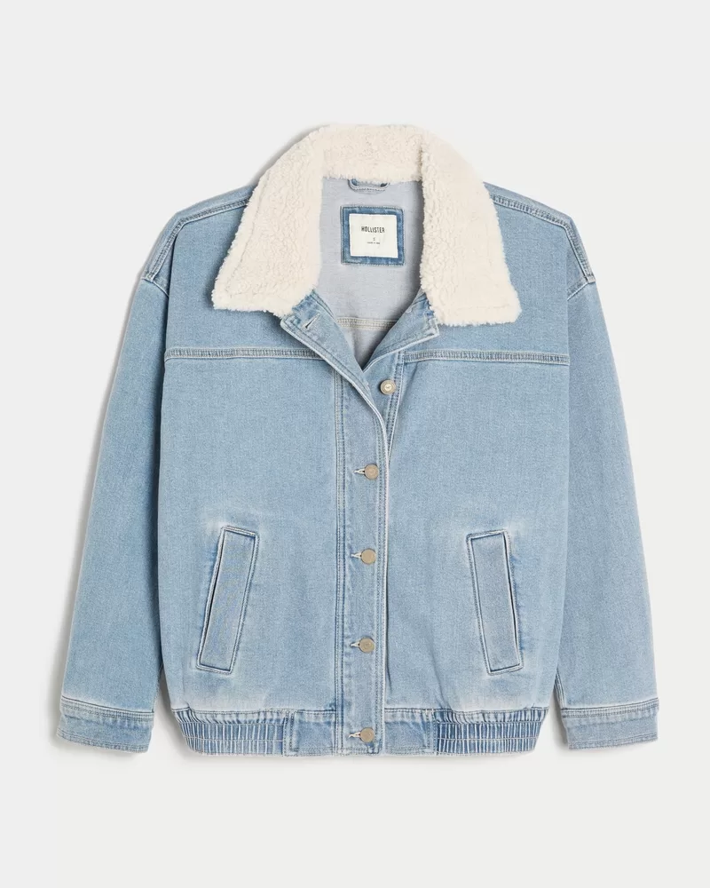 A vintage-inspired denim jacket in a light wash, featuring a sherpa collar, full button closure and front pockets. Interior phone pocket, banded hem.