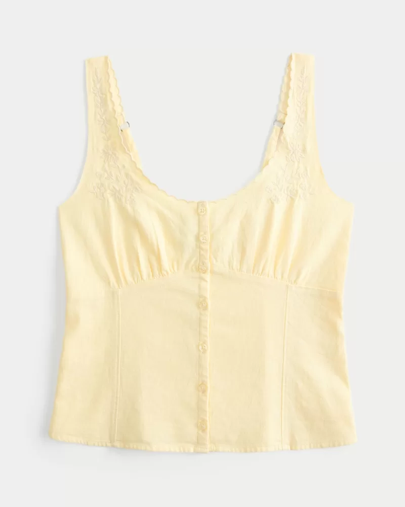 This pretty blouse features pretty embroidered detailing and scalloped trim along the straps, a scoop neckline and button-through closure. Soft smocked back. Slim Fit.