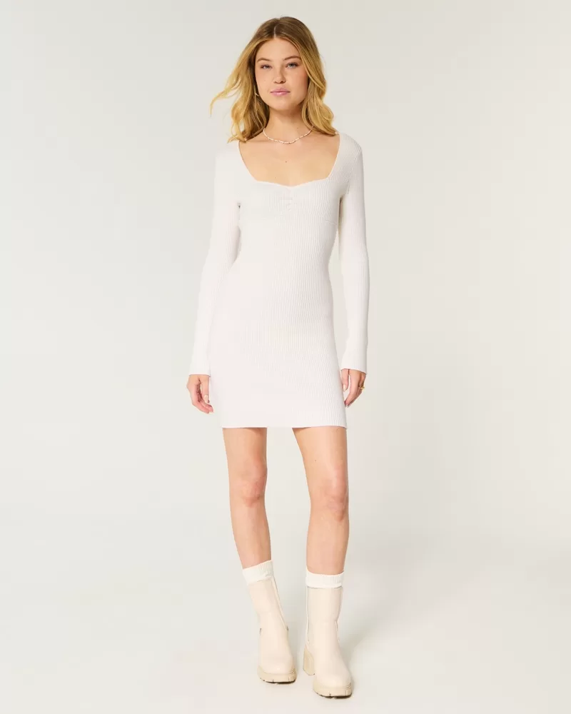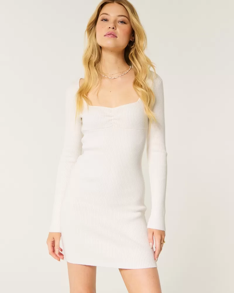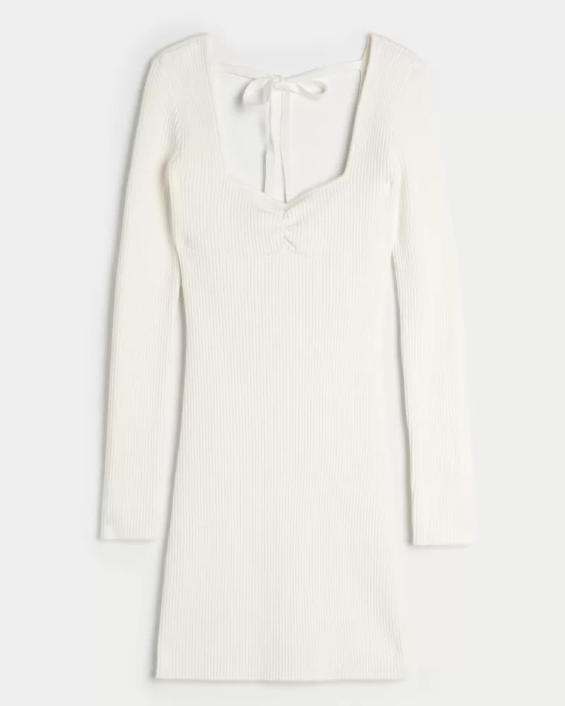 Long-Sleeve Cinch Bust Open-Back Sweater Dress