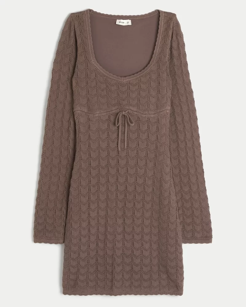 This pretty long sleeve, mini-length dress is made with super soft crochet-style fabric and features a scalloped neckline. Waist tie detail.