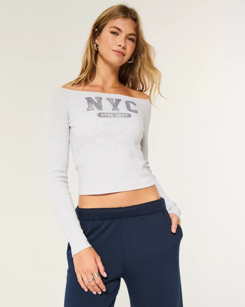 A cute and comfy long-sleeve t-shirt in 100% cotton, featuring NYC Athl Dept print graphics and an off-the-shoulder neckline.