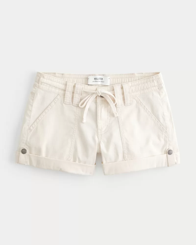 Cute and comfy shorts in twill fabric, designed with a low-rise drawstring waist and adjustable hems. 3″ inseam rolled, 5″ inseam unrolled.