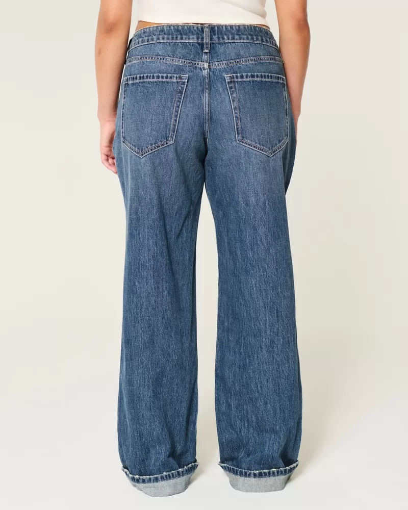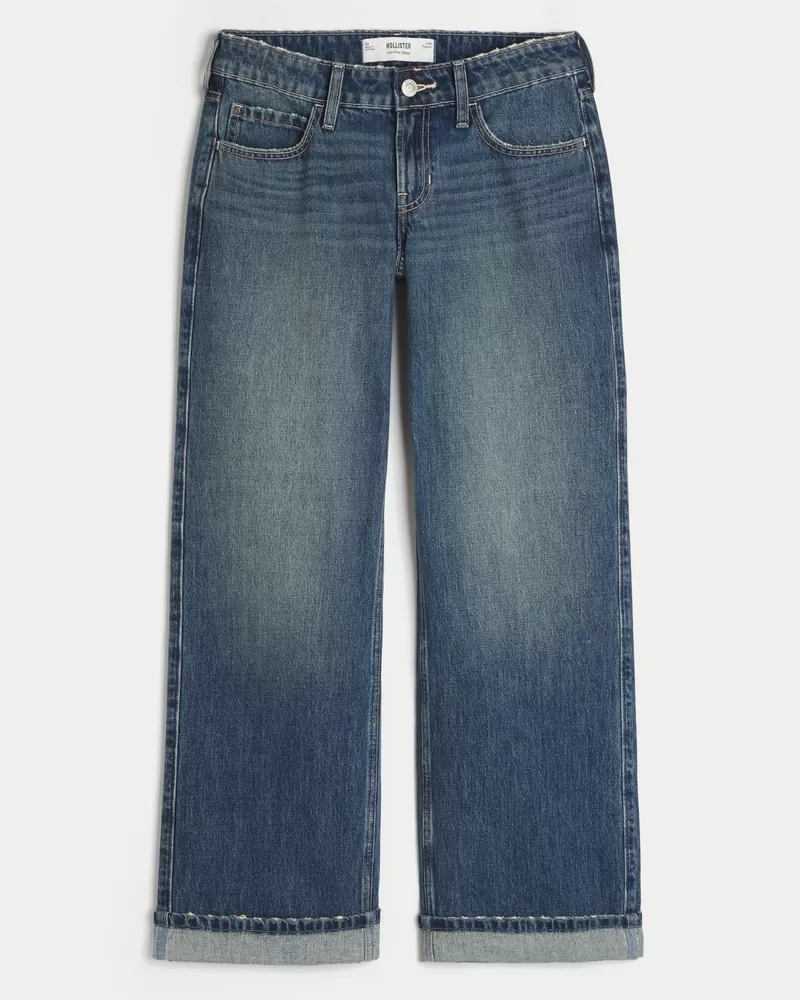 Cute and comfortable jeans in a dark wash, designed with a flattering low-rise waist and baggy leg. Fading, whiskering, cuffed hems.