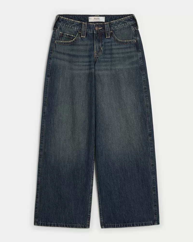 Cute and comfortable jeans in a dark wash with fading and whiskering, designed with a flattering low-rise waist and super baggy leg.