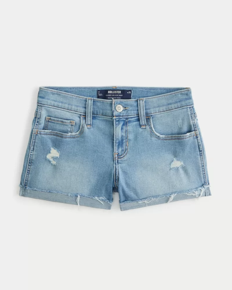 Cute denim shorts in a light wash with distressed detailing, fading and cuffed hems. Low-rise waist.