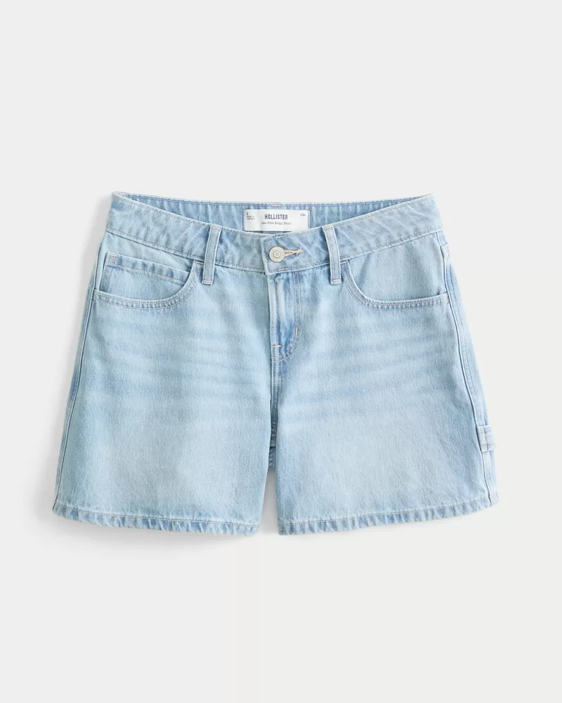 Cute and comfy denim carpenter shorts in a light wash, designed with a low-rise waist and baggy fit. Left hammer loop, 5″ inseam.