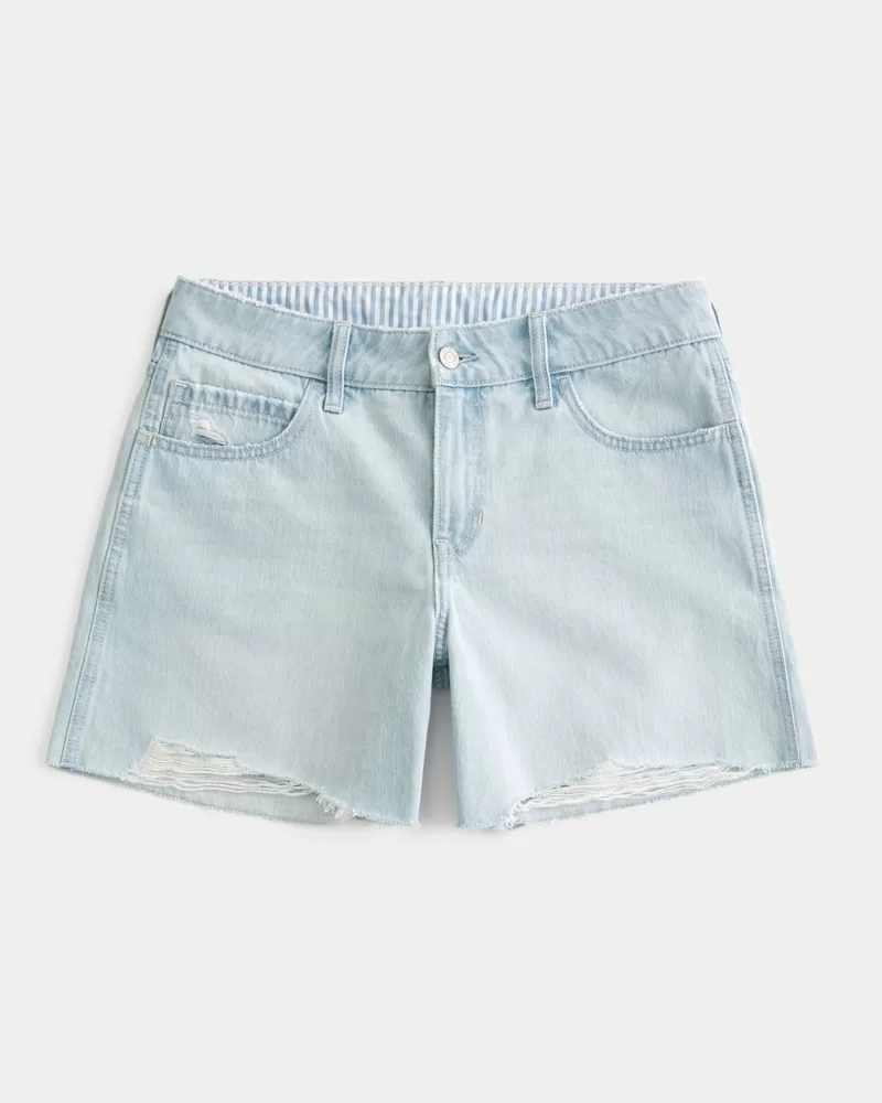 Cute and comfy denim shorts designed with a baggy fit and low-rise waist. Light wash, distressed hems, patterned interior waistband, fading, whiskering. 5″ inseam. Imported.