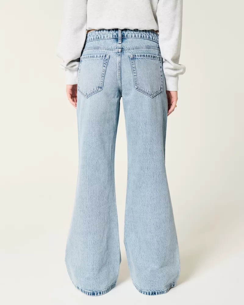 Ultra-comfortable jeans in a light wash, designed with a baggy leg and flared hem. Flattering low-rise waist.
