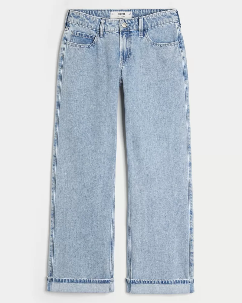 Cute and comfortable jeans in a light wash, designed with a flattering low-rise waist and baggy leg. Cuffed hems.