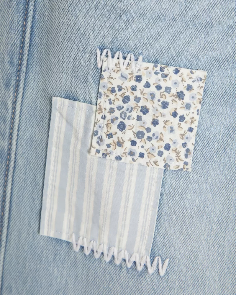 Comfortable denim jeans in a light wash with patchwork details. Flattering low-rise waist, baggy leg, fading and whiskering, distressed details.