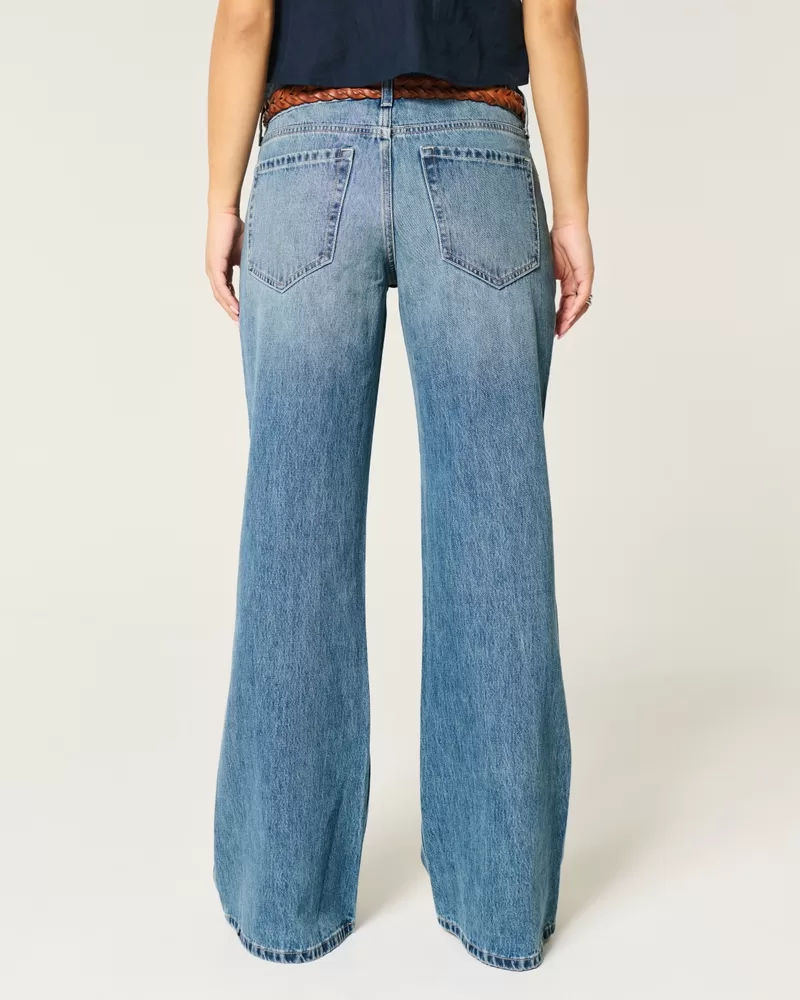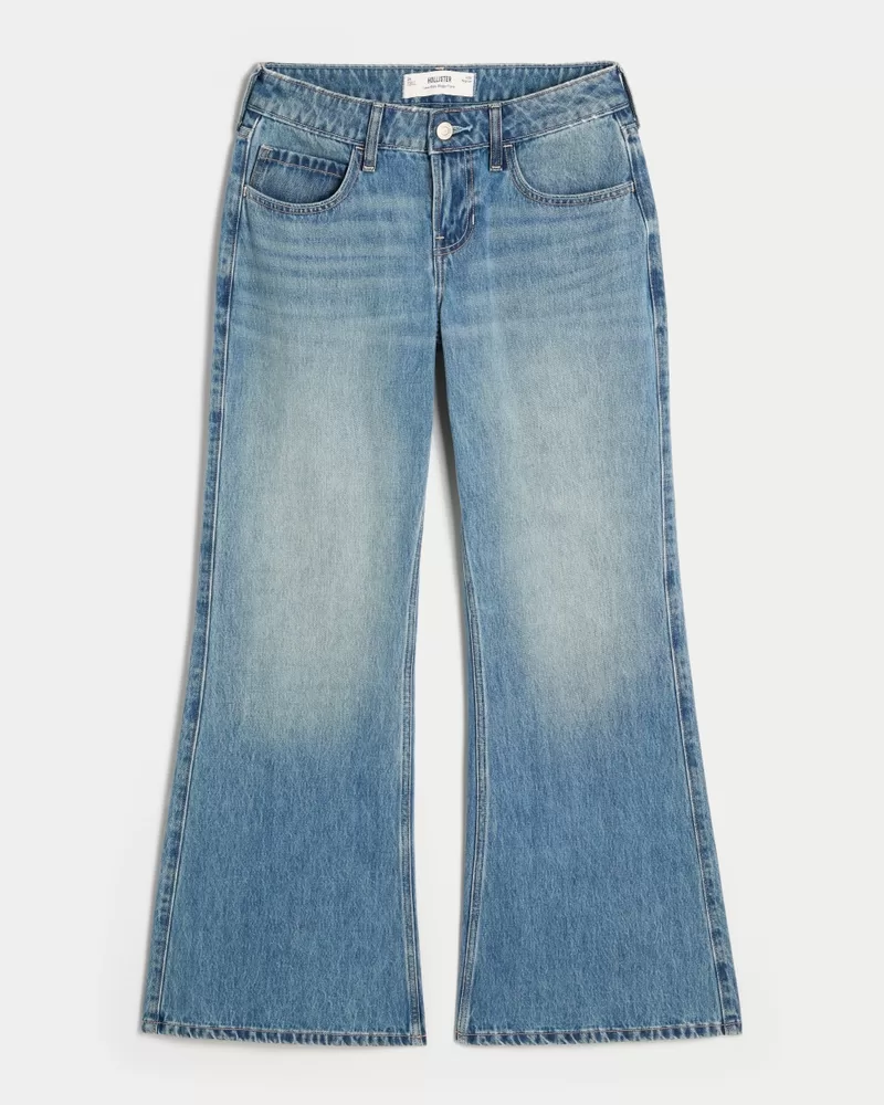 Comfortable jeans designed with a low-rise waist, baggy leg and flared hem. Medium wash denim with fading and whiskering.