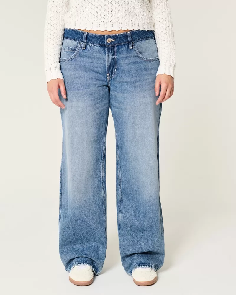 Cute and comfortable jeans in a medium wash, designed with a flattering low-rise waist and baggy leg. Fading and whiskering.