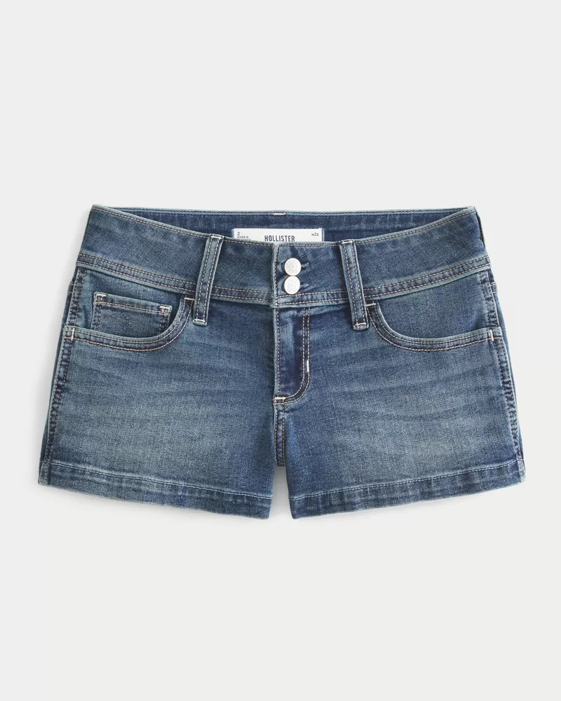 Cute and comfy denim shortie shorts in a medium wash with fading and whiskering. Low-rise waist.