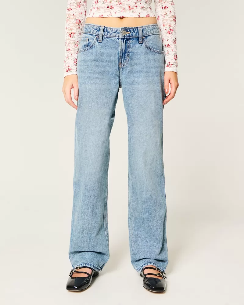 Low-Rise Medium Wash Eyelet Bow Loose Jeans