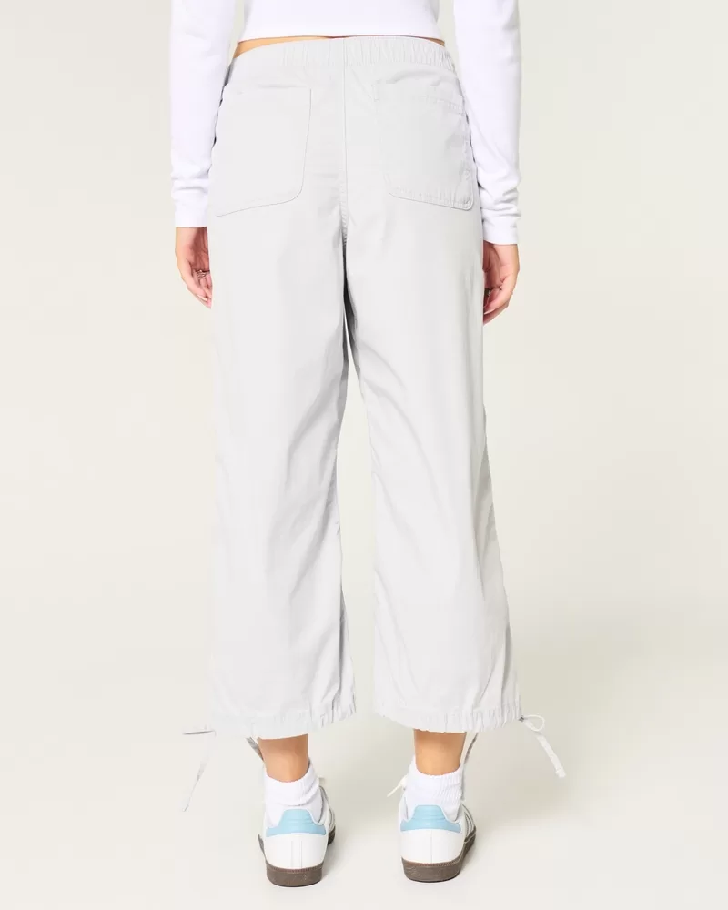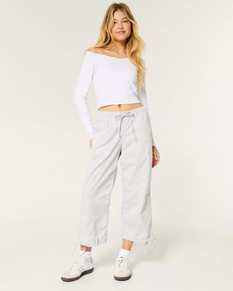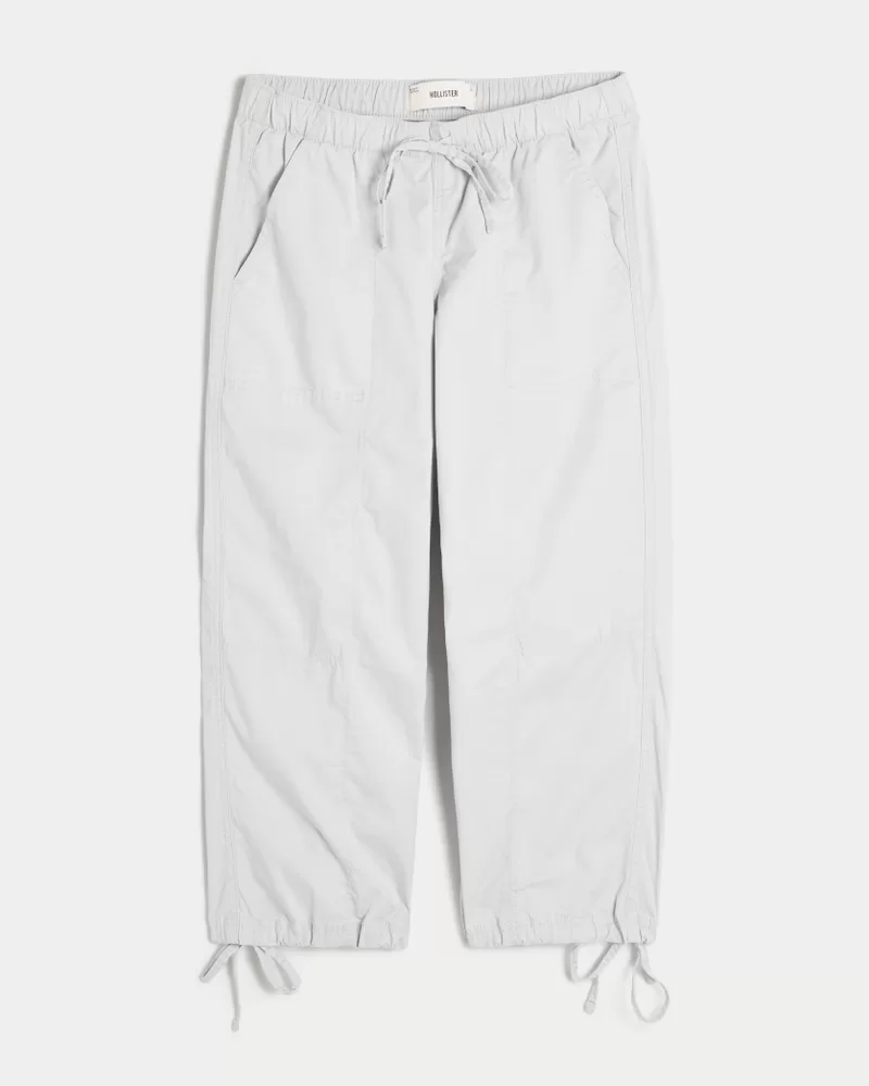 Ultra-comfortable pants designed with a low-rise drawstring waist and drawstring hems. Capri length, baggy leg, pockets. Imported.