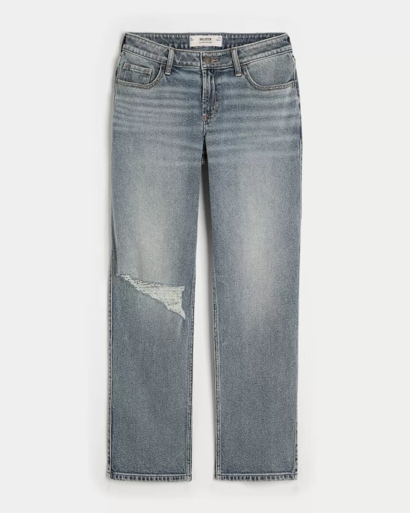 Low-Rise Ripped Medium Wash Straight Jeans